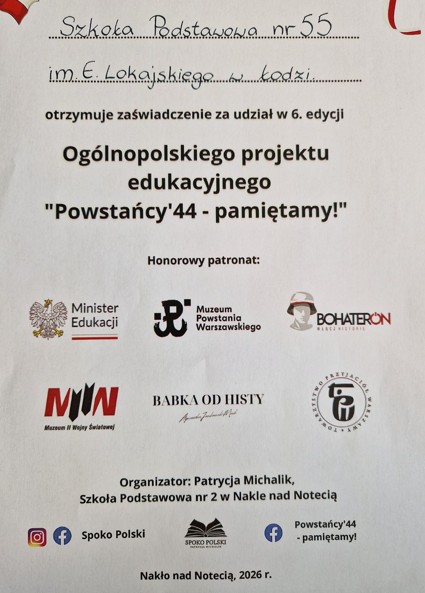 Uczniowie klasy 8b i 8c zrealizowali na lekcjach historii zadania Ogólnopolskiego projektu edukacyjnego Powstańcy 44 - pamiętamy. Celem projektu jest rozwijanie wiedzy historycznej dotyczącej Powstania Warszawskiego, budowanie tożsamości narodowej uczniów, rozbudzanie uczuć patriotycznych. Udział w projekcie przyczynił się do kształtowania postaw szacunku wobec historii i jej bohaterów. Kontakt z relacjami świadków historii oraz materiałami źródłowymi sprawił, że przeszłość stała się bardziej realna i poruszająca.