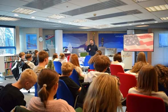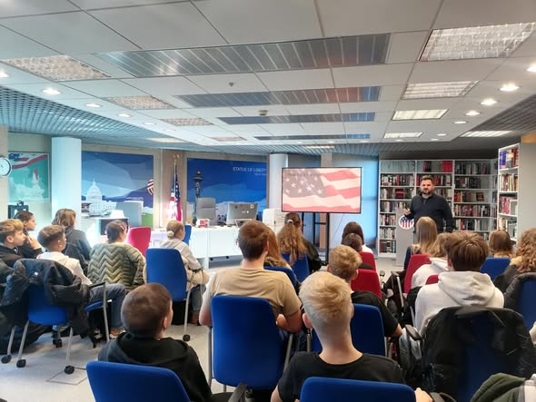 W dniu 6 listopada uczniowie z klas 5,6,7 i 8 wzięli udział w wykładzie w języku angielskim na temat historii, kultury oraz polityki Stanów Zjednoczonych. Spotkanie miało miejsce w Amerykańskim Centrum Kultury i Informacji 'American Corner' a spotkanie prowadził dr Michał Woźniak. Uczniowie mieli okazję nie tylko zdobyć wiedzę o Stanach Zjednoczonych, ale również osłuchać się z językiem angielskim.